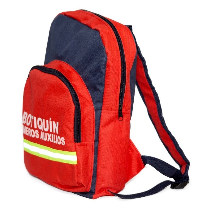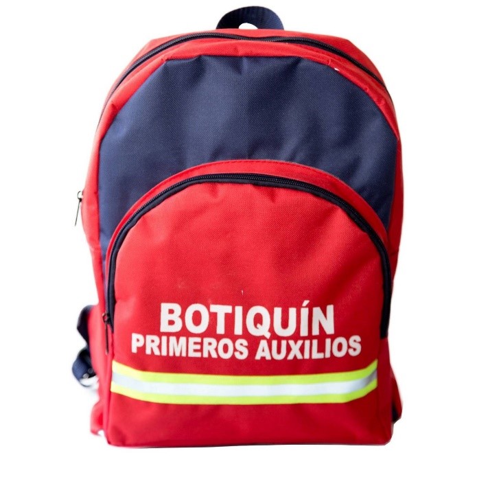 BOTIQUÍN RECOMENDADO POR ARL: Botiquín morral sencillo elaborado en lona morral de 35cm X 30cm X 8 cm compuesto por dos bolsillos (uno grande y uno pequeño), reata para cargar en hombros, estampado a una tinta, dotado con 27 elementos.